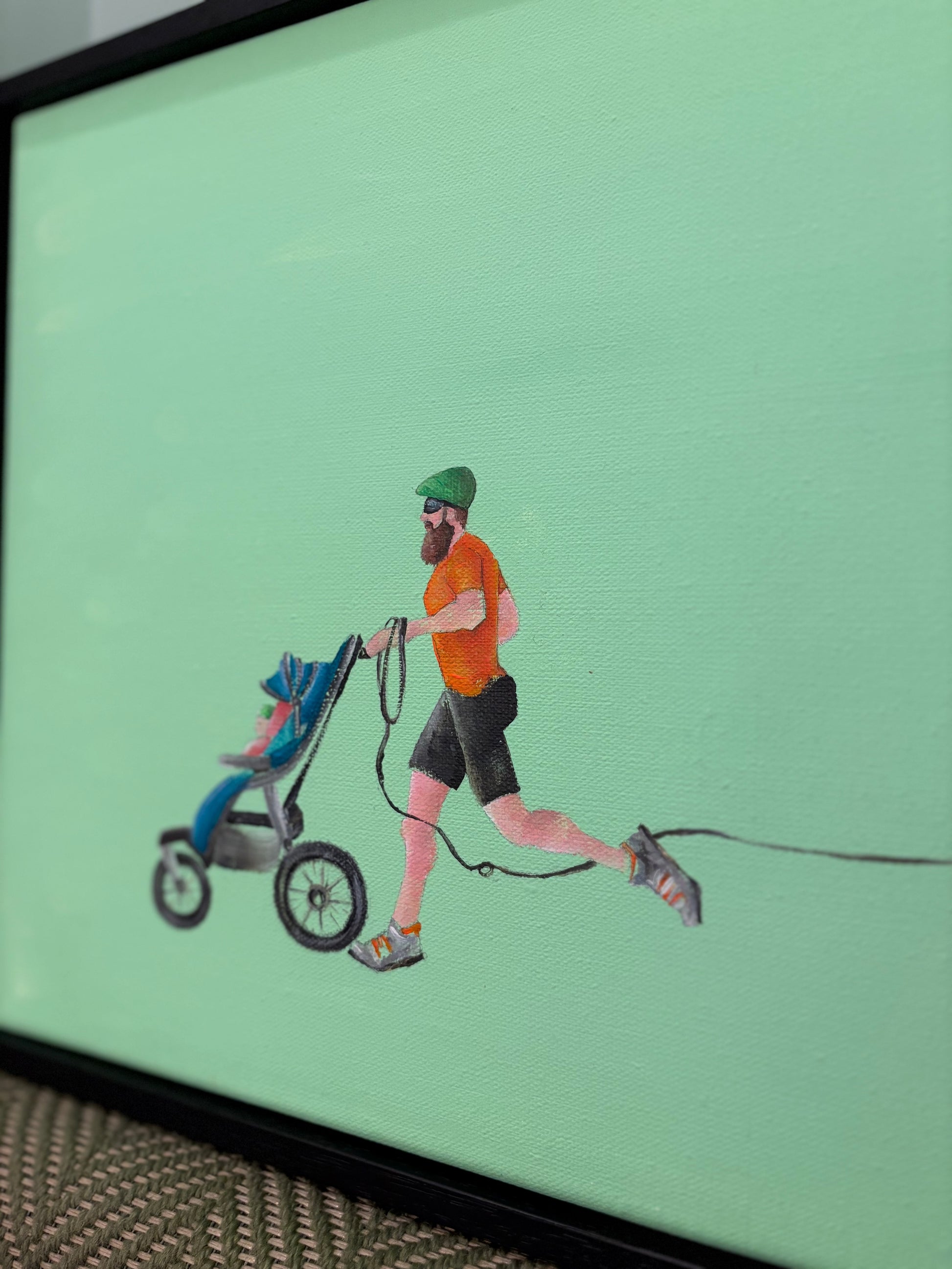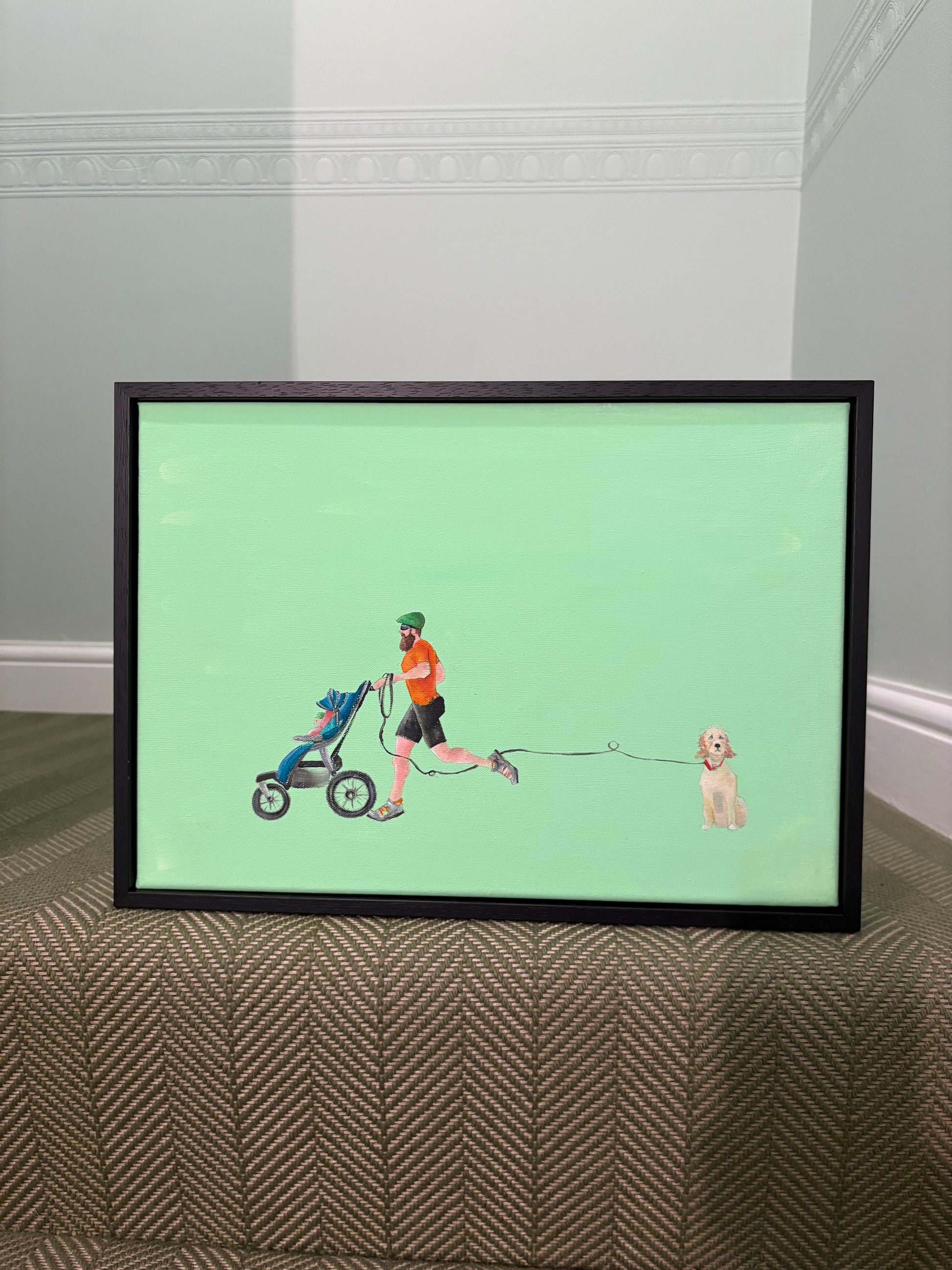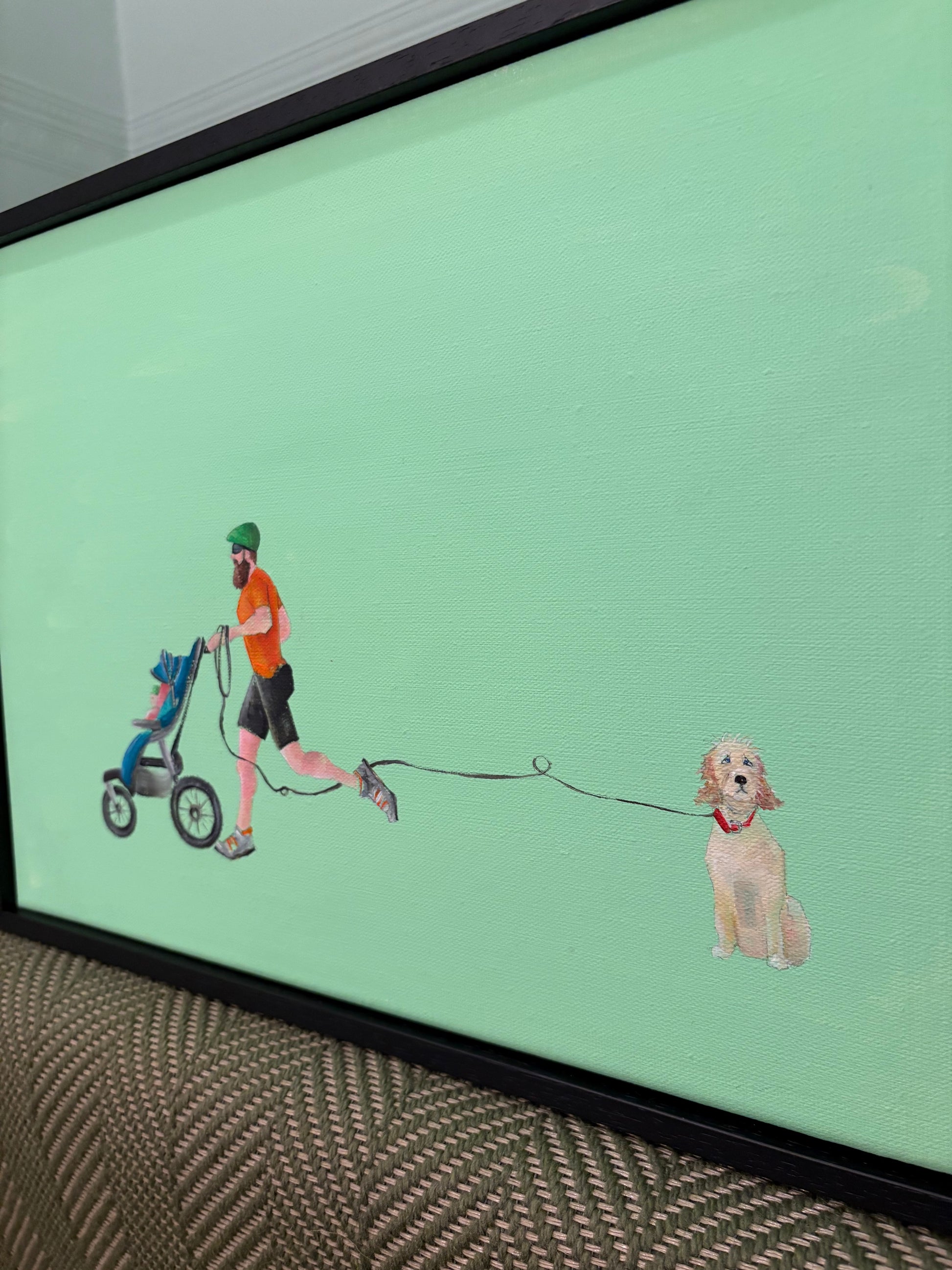 He’s managing to navigate the streets jogging, taking the baby to nursery, and all with the dog in tow !